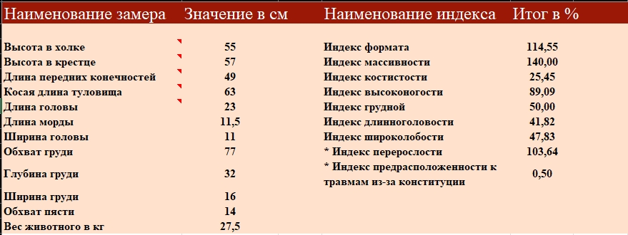 Файл «Промеры» содержит в себе Exel-таблицу, в которую вы можете внести замеры своей собаки в см и посмотреть индексы, соответствующие тому или иному показателю стати и экстерьеру собаки.